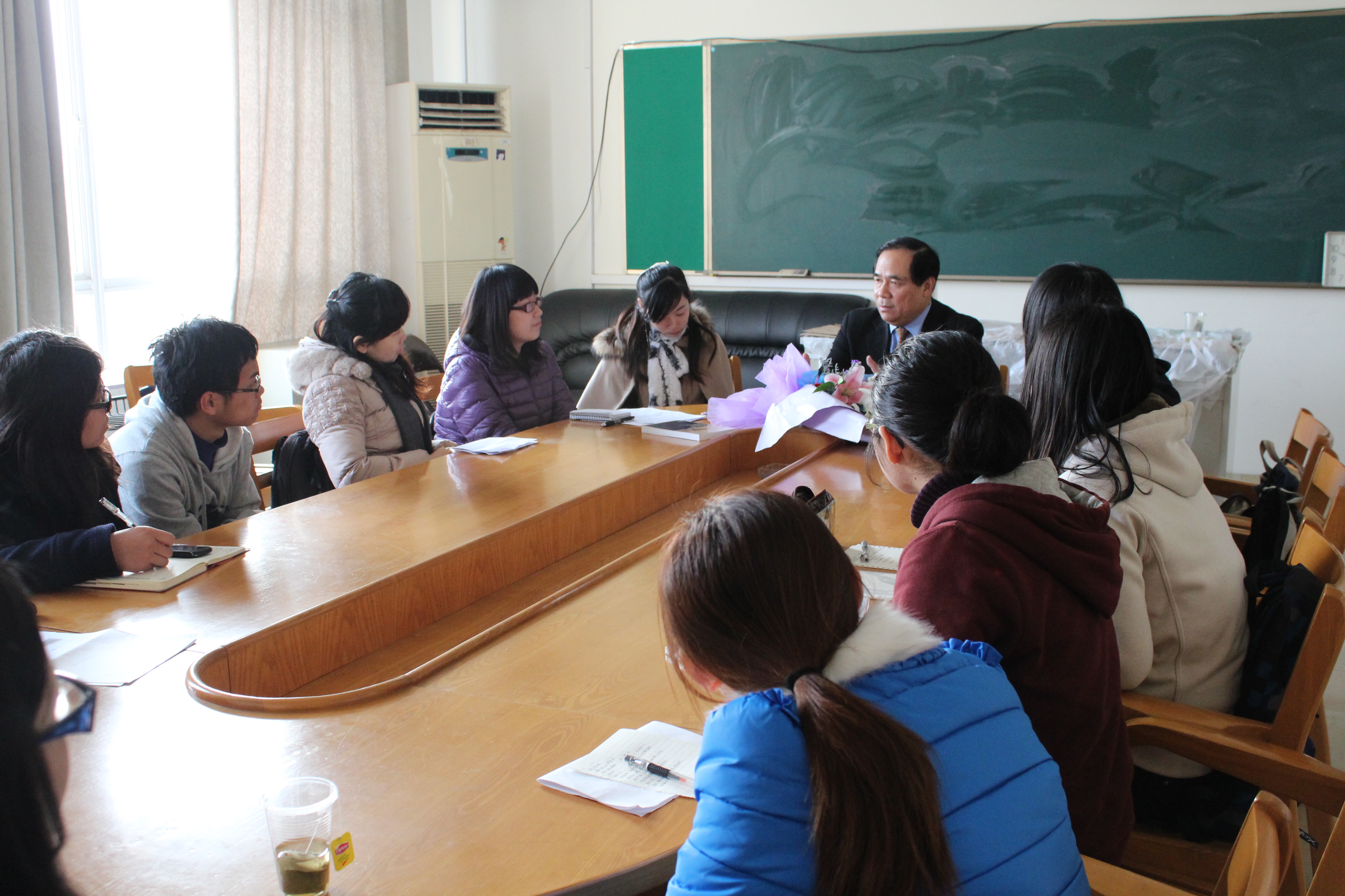 讲座结束后,陈峰先生在英语学院会议室,继续接受了国际公务员人才实验班同学的采访,与国公班同学进行了面对面的交流。陈峰先生与国公班同学就当前的联合国招考情况、中国人在国际组织和国际事务中发挥的作用、国公班同学外语能力和综合知识的积累、翻译的学习和实践等问题进行了交流。他勉励国公班同学努力学习,打牢专业基础,做好知识积累和储备,积极投身国际公务员事业,争取在国际事务中为我国争取更大的发言权,并向英语学院赠送了联合国介绍的英文书籍。