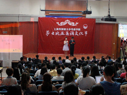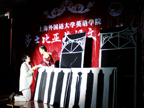 529日晚,英语学院第十八届“莎士比亚英语文化节”系列活动之“英韵华章”莎士比亚戏剧公演在松江校区图文东厅精彩呈现。英语学院院长查明建教授、党总支书记孙俭老师、副院长许立冰老师和部分专业课教师、辅导员作为嘉宾出席了本场晚会,英语学院大二年级教研组的老师们作为专业评委出席了本场晚会。此外,上海外国语大学就业指导中心副主任、飞那儿剧团指导教师、莎士比亚戏剧公演特邀指导教师李然老师也出席了本场晚会。当晚的演出由英语学院2012级全体同学倾情奉献,通过精彩诠释将莎翁经典剧目《罗密欧与朱丽叶》、《仲夏夜之梦》和《威尼斯商人》搬上了校园舞台,为今年的莎士比亚英语文化节系列活动画上了一个华丽的句号。