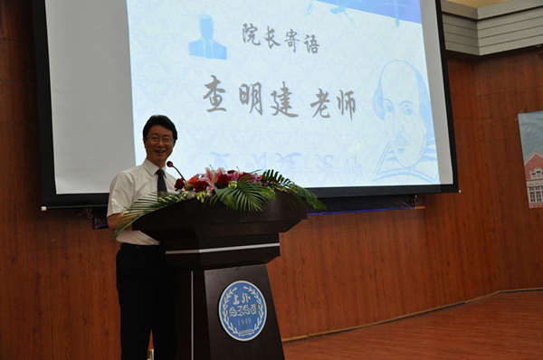 精心制作的开场视频用画中画的形式记录了四年英华令人难忘的大事纪:青青校树、热血球场、支教活动等熟悉的画面依次展开,引发了现场同学们的深深共鸣。随后,查明建院长首先代表学院为毕业生致辞。从20102014,对于每一个英华人,都是勇敢逐梦的四年。在致辞中,查院长娓娓道来英语学院人文化改革的努力与目的,更表达了对毕业生保持诗意人生境界和高尚的人生立意追求的寄望。在致辞结尾,查院长深情朗诵由2014届每一位毕业生的名字串成的诗词,传递着一位学者和师长对于学子们的关怀和期望。