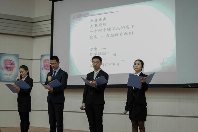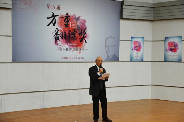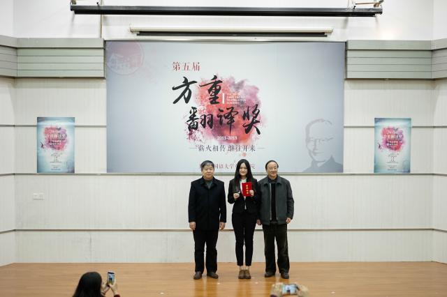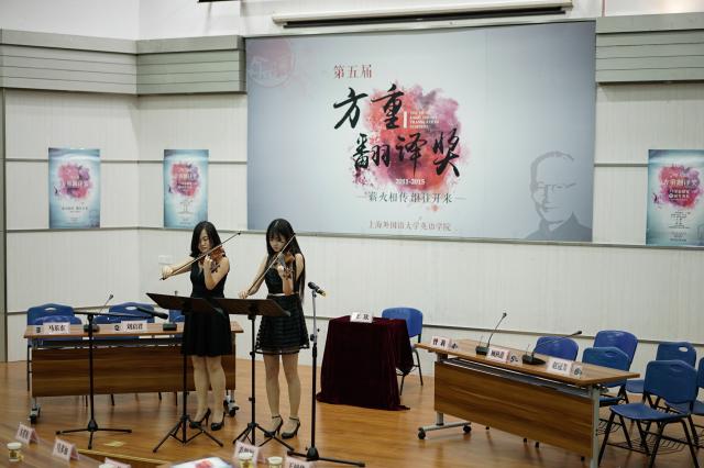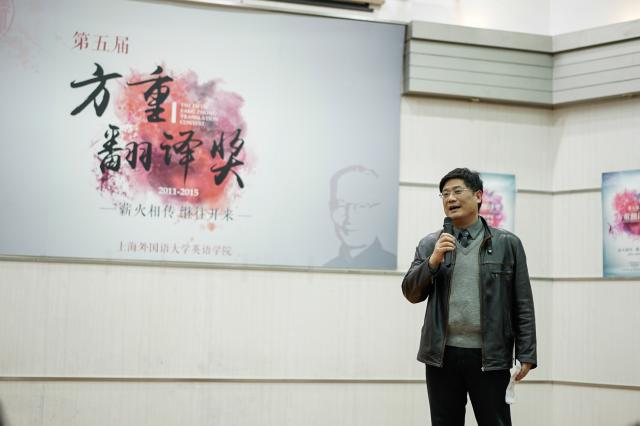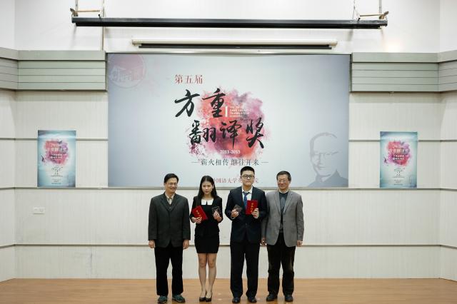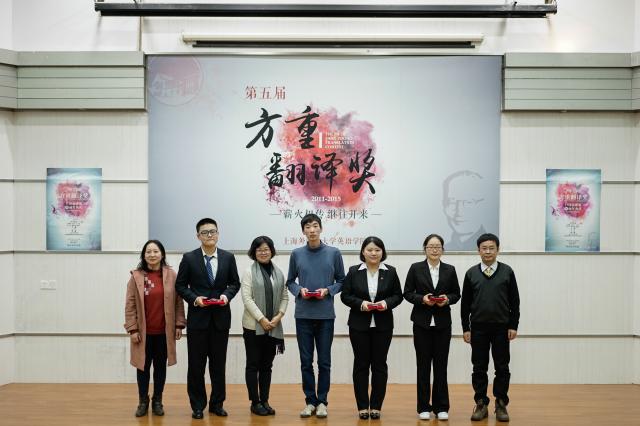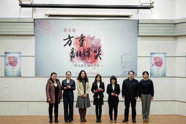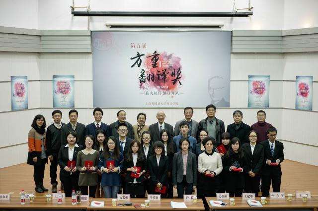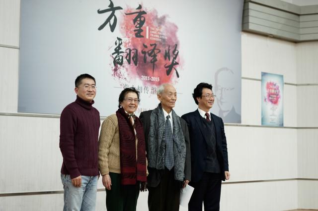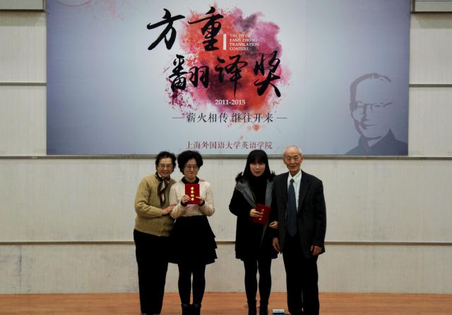 2015年是“方重翻译奖”设立五周年。方重先生之次子方若柏先生及其夫人马多加女士应邀专程从北京赴上海参加颁奖典礼。典礼开始前,现场播放由方重先生亲自朗诵其翻译的陶诗《归园田居》节选,这是由方若柏先生提供的珍贵录音资料。在场师生无不屏息凝神,仔细聆听,感受这一份穿越时空的厚重。“方重翻译奖”颁奖典礼的开场延续传统,四位学生代表朗诵了查明建院长创作的诗歌——《我们的方重》。朗诵者字字铿锵、句句有力,尾声中“虽不能至,心向往之”把颁奖典礼的开场气氛推向了高潮。