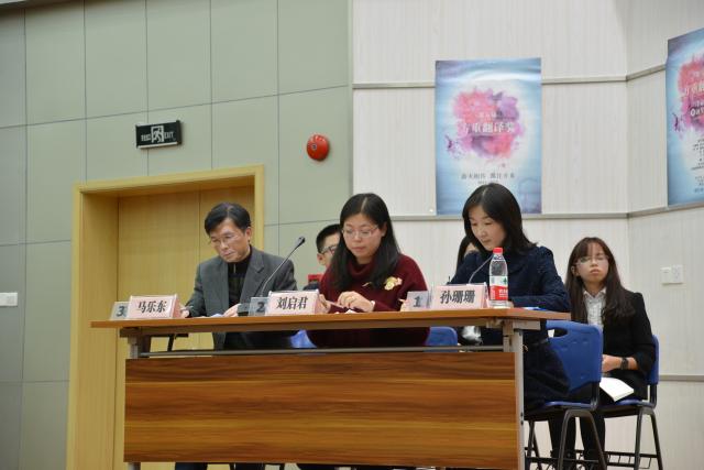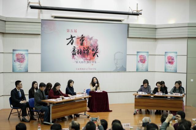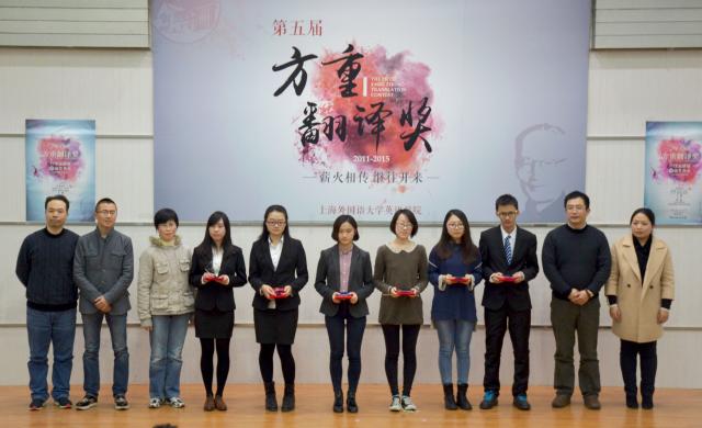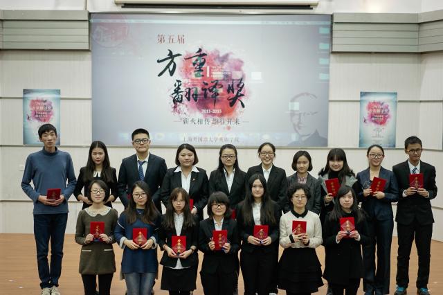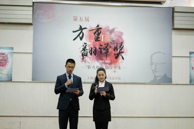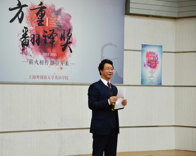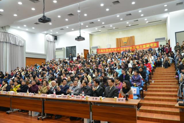 12月8日晚六点,第五届“方重翻译奖” 颁奖典礼暨口译表演赛在松江校区图文东厅隆重举行。英语学科资深教授虞建华、张健教授,教务处处长姜智彬教授、学科办主任王志强教授、文学研究院副院长张和龙教授、研究生部党总支书记杨雪莲老师、招办主任王斌华老师、招办副主任陈军老师、教务处副处长孙建副教授、研究生部副主任张绍铎、肖琳老师,国际教育学院副院长郭晓梅老师、国际教育学院院长助理田小勇老师等嘉宾应邀出席观摩。英语学院院长查明建教授、党总支书记孙俭老师、副院长许立冰副教授、王欣教授、孙会军教授出席了颁奖典礼。此外出席嘉宾还有英语学院和国际教育学院多位专业课老师。同时我校学联和各院系学生会主席、国际文化交流学院留学生(包括孔子学院奖学金留学生)以及上海各重点中学的同学们也参加了此次典礼。