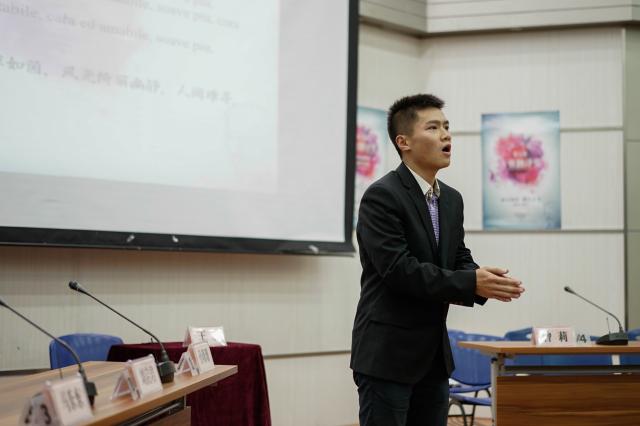 随后,英语学院院长查明建教授致辞,他高度评价了方重先生在乔叟研究与翻译、莎士比亚戏剧翻译及陶渊明诗文翻译方面的杰出成就,深切缅怀他对创建我校英语学科及比较文学学科的奠基性贡献。他指出,“方重先生学贯中外而虚怀若谷,成就卓著而内敛低调,一生淡泊名利而孜孜于教书育人、钻研学问,卓然而为‘格高志远、学贯中外’之典范。”他回顾了“方重翻译奖”和“方重学术奖”等设立的背景和历史,希望在座的同学们牢记方重先生为人和治学的精神,牢记上外人文传统,努力成为人品高尚、英语功底扎实、人文修养深厚的英语专业高端人才。他介绍了近年来英语专业人文化改革的成效,表示对英语专业人文化改革的方向和未来发展充满信心。信心和动力,就来自方重先生等前辈所给予的精神感召和人文力量。最后,查院长衷心感谢为本届“方重翻译奖”口笔译大赛评审付出辛勤劳动的38位老师。他以“填词”的方式将老师们的名字排句组合,读来合辙押韵,抑扬顿挫,赢得全场阵阵赞叹与掌声。随后查明建院长向参加大赛筹备工作的老师、同学、辩手和评委表示感谢,并宣布口译表演赛及颁奖典礼开始。