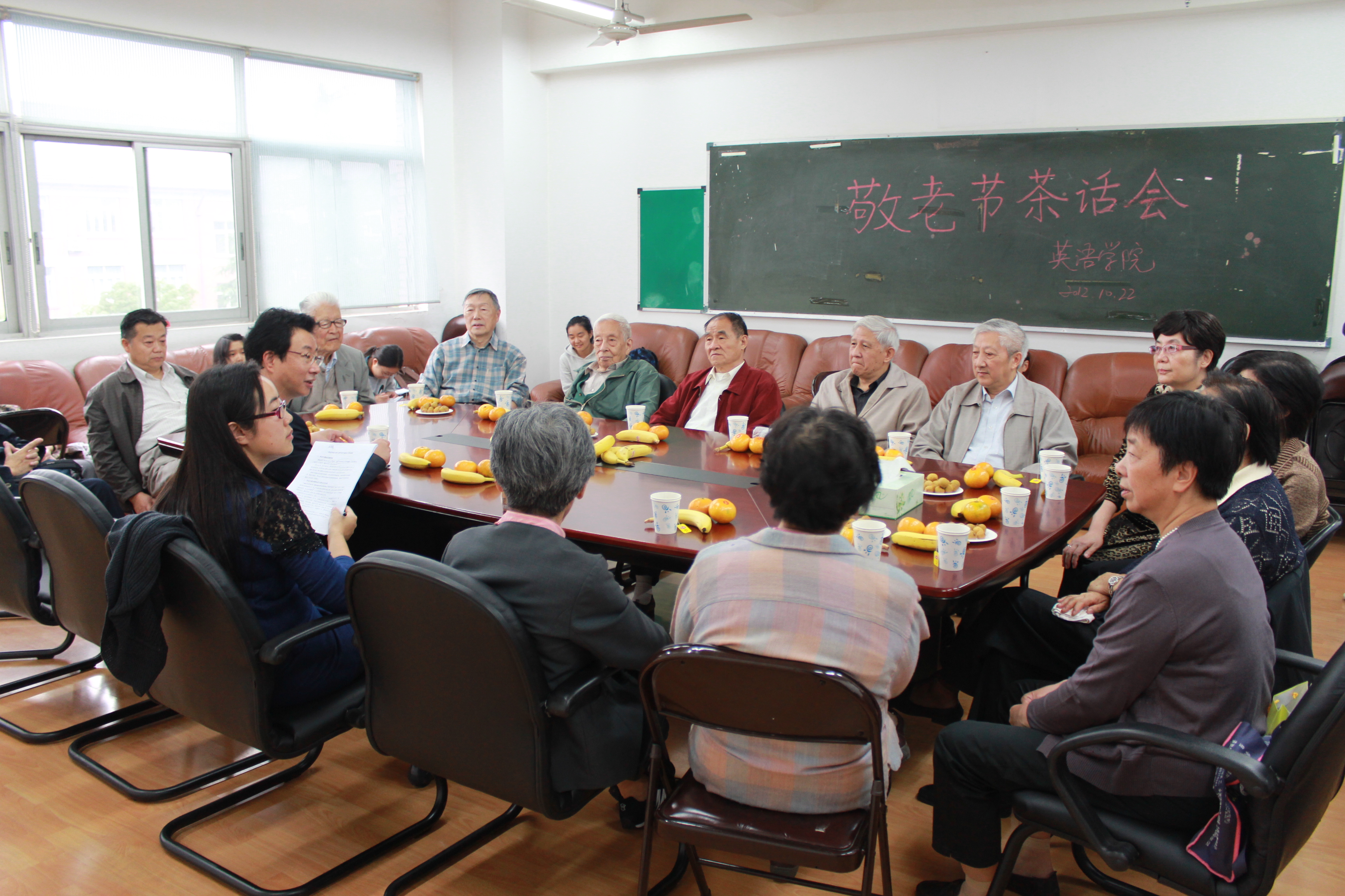 2012年10月22日,英语学院在虹口校区会议室举办了敬老节活动。学院24位离退休教师、学院党政领导及部分教师学生代表参加了活动。