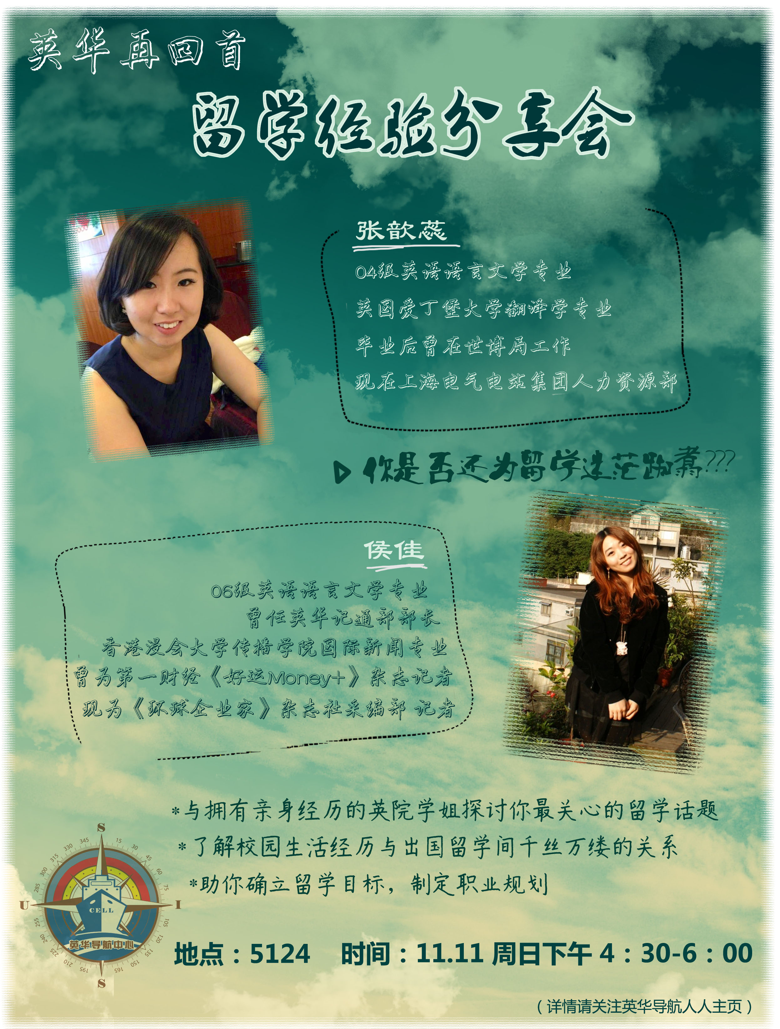 继由专业教师主讲的“英华师生话留学”讲座之后, “英华再回首”首场校友留学经验分享会11月11日在5124教室顺利举办。英华导航服务中心邀请到了04级英语语言文学专业的张歆蕊与06级英语语言文学专业的侯佳两位英华校友,与英语学院的同学们分享留学经历和职业规划的思考。