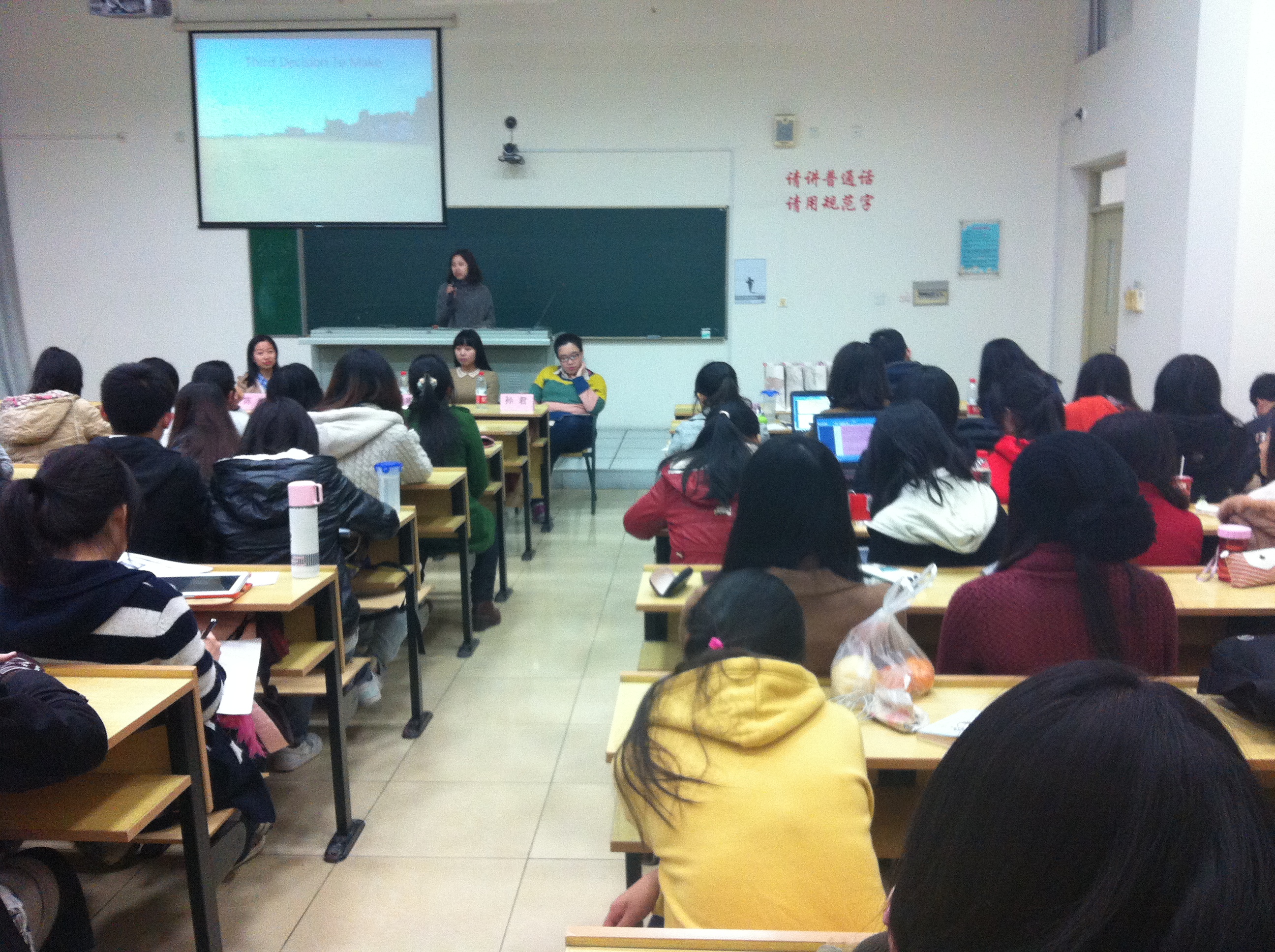 在分享会中,目前在贤达人文经济学院担任专业课教师的陈琳(02级)首先分享了她在上海国际艺术节组委会工作的经历,她从工作经历中发现自己对戏剧的热爱,并选择前往英国华威大学攻读比较文学和文化研究专业硕士。她建议同学们对留学有个比较明确的规划,才能在留学的过程中有的放矢。目前在银华基金管理有限公司高端客户部工作的吴瑾怡(05级)通过PPT形式,系统介绍了自己毕业时候如何进行选择、如何确定海外留学的学校和专业、海归求职的优劣势、申请材料的准备和国外的学习生活情况。目前在SAP公司担任IT咨询的黄羽飞(06级)结合在英国帝国理工学院学习科技翻译的经历,向在座同学讲述了她转型进入IT行业的求职过程和工作思考。她还建议同学们注重培养语言能力和学习能力,鼓励同学们勇于抓住感兴趣的机会进行尝试和挑战。目前在霍特国际商学院工作的孙君(06级)向同学们介绍了香港的留学环境和申请流程,她强调了口语能力的重要性并建议同学们能够培养自己的特殊竞争力。四位学姐的分享内容十分详细和真实,在座的同学们在了解学姐经历的同时,更是对自己如何选择以及如何规划都有了更深入的思考。