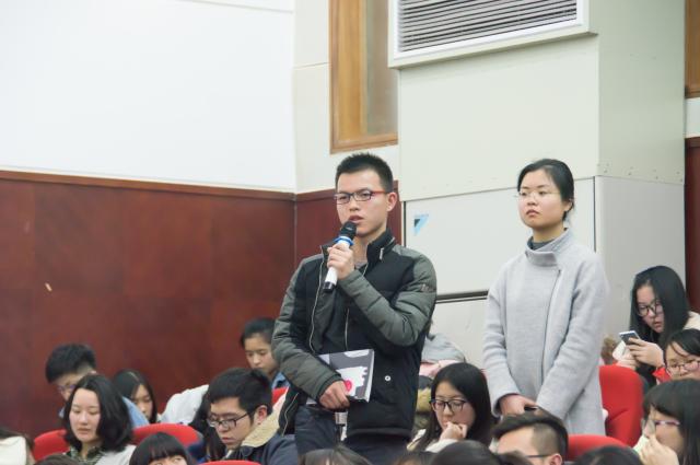 在接下来的提问环节中,上外学子与主讲人进行了热烈的互动,几个同学用流利的法语与Vanessa Badré女士进行了交流,就摹仿与创新的边界、有意义的混乱(disorder)和无意义的混乱之间的区别、艺术的有用与无用之间的理解、法律学习和艺术史学习之间的关系等问题想主讲人进行了请教。Vanessa Badré女士耐心倾听了同学们的疑问,巧妙绝伦的回答赢得了全场掌声。Vanessa Badré女士表示,上外学子的语言能力和思辨精神给她留下了非常深刻的印象,并且她对上外的底蕴深厚的人文氛围和卓越的多语种环境表示非常赞赏。