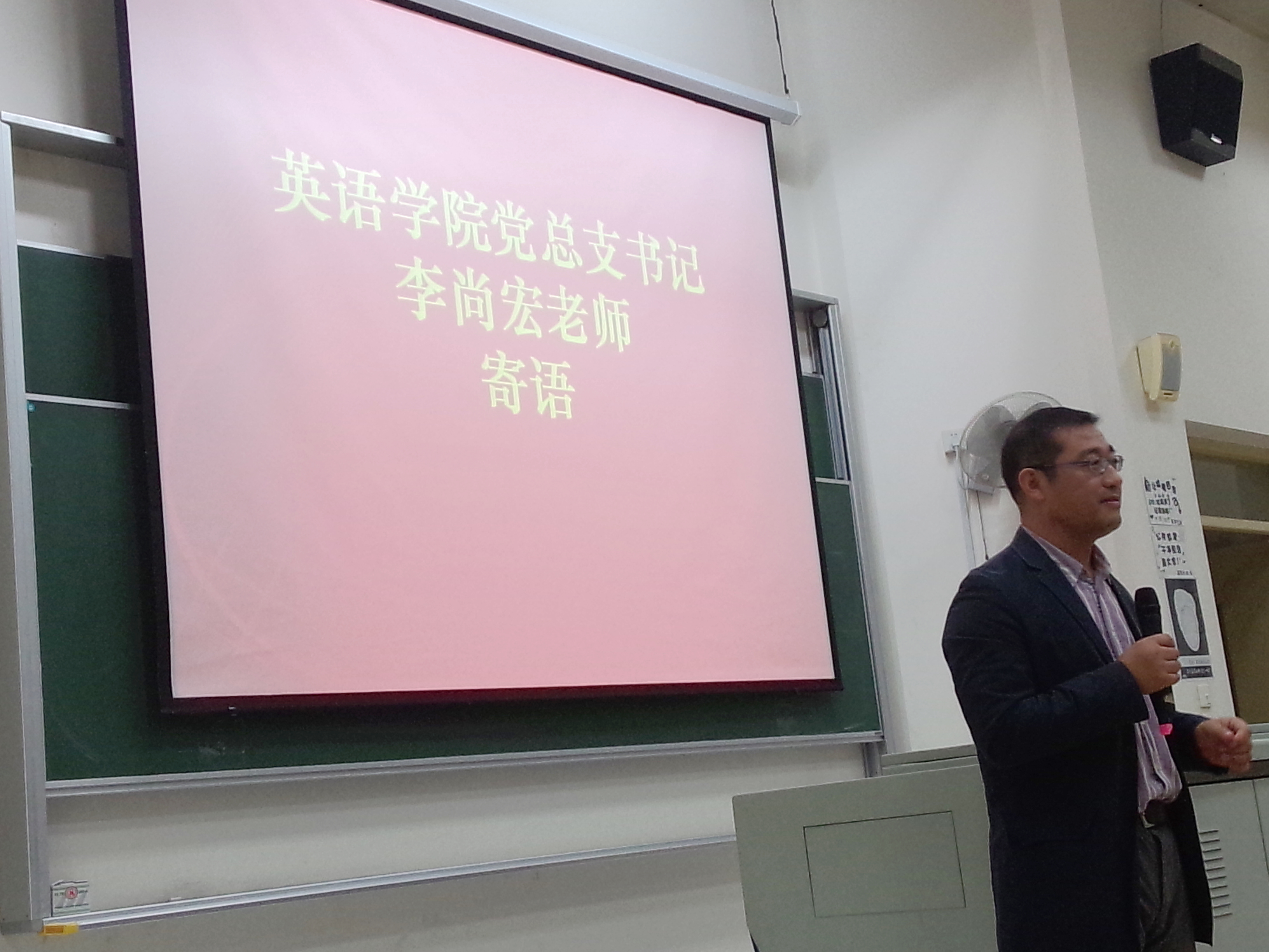 最后,英语学院党总支书记李尚宏老师发表了以境界为题的真挚寄语。他说,做人最重要的是要学会爱、学会立德,一个人的能容下多少事物决定了他的境界高低。他旁征博引,指出高境界的主要内涵和重要意义。李尚宏老师还说,学习党章,并不是想用它来束缚我们的思想;相反,我们要做一个有情怀、有胸怀、有境界的人。这一番语重心长的寄语,让在场的每一个人的心灵都受到了极大的震撼,陷入思考之余,大家默默在心中对“将来要成为怎样的人,怎样成为这样的人”这个问题有了自己的答案。