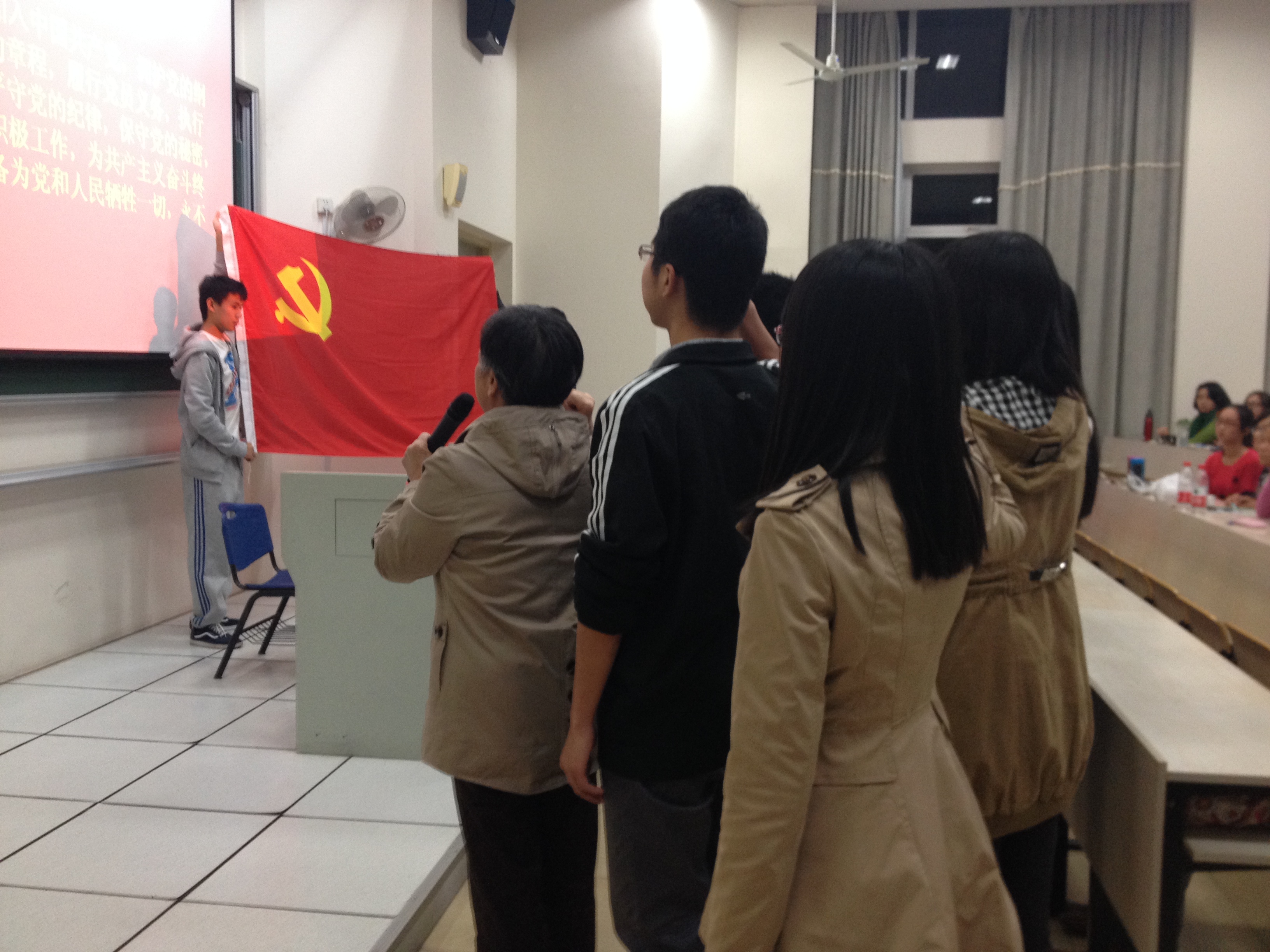 首先,徐文文老师带领13、11、10级的十余名预备党员在党旗下庄严宣誓。望着鲜艳的党旗,念着铿锵有力的誓词,每一位同学的心中都感受到了自己肩上作为党员的责任重量,不知不觉间对党也有了一份更深的理解。