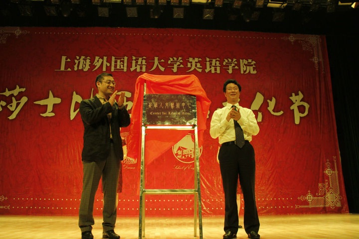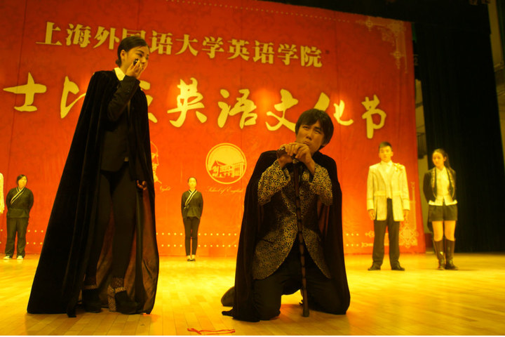 530日晚,英语学院第十七届“莎士比亚英语文化节”系列活动之五——“英韵华章”莎士比亚戏剧公演在松江校区教育会堂大礼堂压轴登场。英语学院2011级全体同学倾情奉献,精彩诠释,将莎翁经典剧目《驯悍记》、《奥赛罗》和《第十二夜》搬上了校园舞台。同时,由顾悦老师指导的旨在全方位提高英语学院人文艺术环境,让人文情怀和艺术氛围弥漫课堂内外的“英华人文艺术中心”也正式揭牌成立。莎士比亚戏剧演出迄今已成功举办了十七届,并成为上外乃至全上海高校的校园文化优质品牌。出席当晚公演的嘉宾有英国领事馆文化教育处艺术项目经理张妤女士和教育项目经理徐洵女士,校就业指导中心主任、飞那儿剧团指导教师李然,校团委办公室主任、大学生艺术中心指导刘昊老师。英语学院院长查明建、党总支书记李尚宏、学院近三十位教师和两名外教参加了活动,二年级精读教研组全体教师担当了评委。担任此次演出的指导教师为李然、刘思远、顾悦和李磊四位老师。