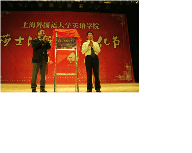“英华人文艺术中心”成立仪式于2013530日晚在第十七届“莎士比亚英语文化节”戏剧公演现场顺利举行。上海外国语大学英语学院院长査明建和党委书记李尚宏共同为英华人文艺术中心揭牌。英国驻沪领事馆文化教育处人员,上外多个学院、部门的领导、老师以及英语学院数百名师生出席了此次成立仪式。
