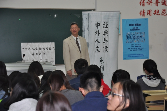 讲座“A Strong Poet: John Milton and his Paradise Lost”于26日晚在松江校区举行,为英语学院“中外人文经典导读”系列讲座第五讲。该场讲座中,叶扬教授带领大家详细解读了英国文学史上最优秀最伟大的的经典长诗——弥尔顿的《失乐园》。首先,叶教授从《失乐园》的创作背景谈起,阐述了文艺复兴时期英国乃至欧洲的思想主流,借此阐发了美国著名批评家和学者Harold Bloom的观念,认为弥尔顿及其作品具有伟大的时代意义,《失乐园》是“strong poet”的典型之作。进而,叶教授深入文本,通过中外经典诗歌对比的方式,从作品的诗歌形式、创作结构、文学语言等方面对《失乐园》进行了全面解读。最后,叶教授畅谈了该作品的深远影响,并鼓励外语专业的学生们要阅读经典、品味经典。