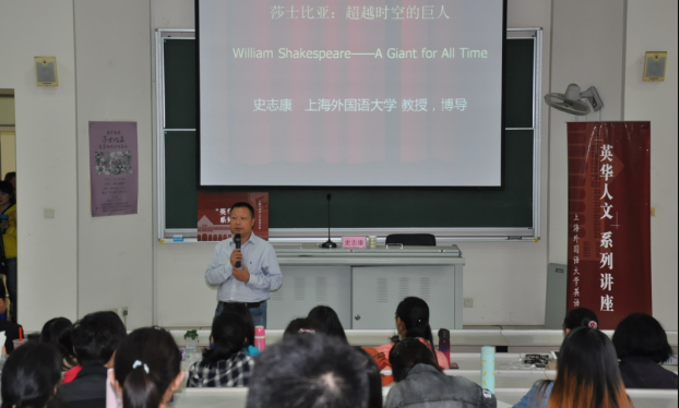2016年5月10日晚,第20届“莎士比亚英语文化节”系列讲座第二讲暨“英华人文系列讲座”第79讲顺利开讲,上海外国语大学博士生导师史志康教授为上外学子带来了题为“为什么说莎士比亚是超越时空的巨人”的精彩讲座,由英语学院副教授陈琦老师主持。