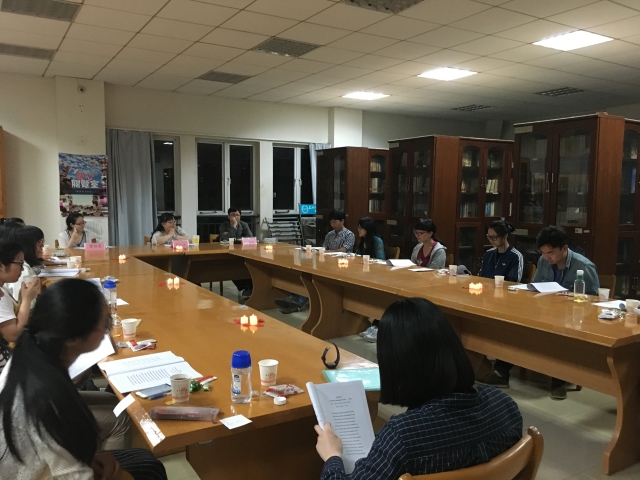 活动现场,14位同学以小组或个人的形式深情朗诵了八首莎翁的十四行诗。每次朗诵结束后,同学会阐述选择该诗歌的理由并分享读诗感想,然后由评委老师进行点评。其间,同学和老师们关于对“美”的讨论将本次诗会推向了高潮。小小的爱阅里,不仅洋溢着优美的朗诵声,还有大家热切的讨论——讨论着爱、讨论着美,讨论怎样读诗、怎样理解诗。