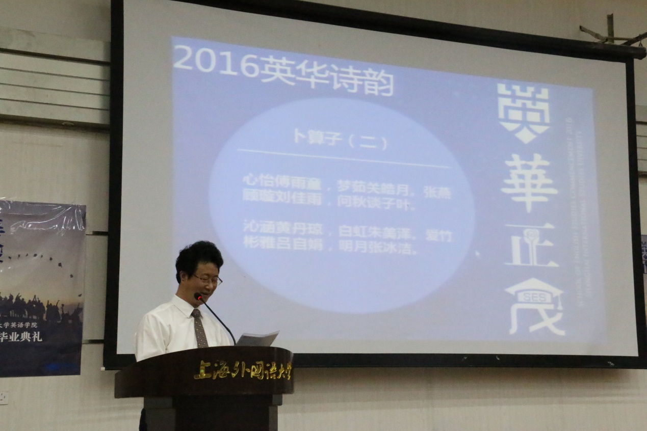 2016年6月17日下午,上海外国语大学英语学院“英华正茂”2016届本科生毕业典礼在松江校区图文东厅隆重举行。英语学院院长査明建、党总支书记孙俭、副院长许立冰、副院长王欣、副院长孙会军、党总支副书记曹原与近三十位学院教师代表及英语学院195名毕业生、部分学生家长参加了此次毕业典礼,共同为将要离开母校的英华学子送上祝福,一同回首四年的上外生活,传承英华人文精神。