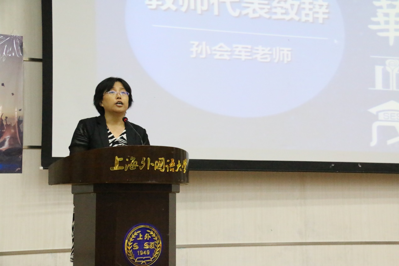 2016届的毕业生们用自己制作的短片《您的一天》来感谢老师们四年的教导。视频将老师们平日里辛勤工作的场景悉数呈现,处处体现着同学们对老师言传身教的铭记与感恩。老师们也在镜头前畅谈对人生的感悟,为即将离开母校的同学们送上祝福与寄语。为感谢老师们四年来的教导与关爱,学生代表上台为到场的老师们送上了毕业纪念品与鲜花。随后,孙会军教授作为教师代表致辞。在致辞中她表达了对2016届毕业生的欣赏与不舍,回忆了四年中同学们在方重翻译奖、莎士比亚英语文化节等各类学生活动和学术赛事中令人难忘的表现,并感谢2016届每一位学生的到来,感谢他们不仅给英语学院带来了荣誉,还有温馨,更多的是诗与远方。在致辞的最后,孙老师引用孔子的名言为毕业生送上寄语:“知者不惑,仁者不忧,勇者不惧。”希望他们在以后的人生道路上都能积极地走向新的生活,不惑、不忧、不惧,勇敢前行。