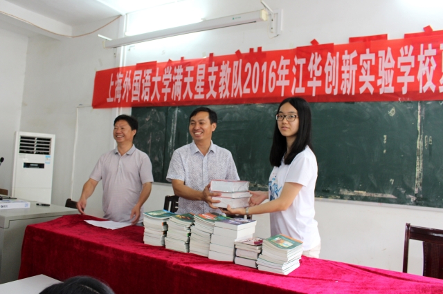 值得一提的是,此次筹备得到了上海外文书店的大力支持。经过队员们的积极沟通,上海外文书店捐赠价值贰仟元的精美外文图书,队员们全部转赠给江华二中初中部,助力当地英语教育发展。