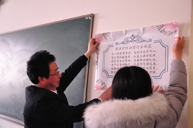 在中共中央国务院《关于加强和改进新形势下高校思想政治工作的意见》大背景和我校“思政创新年、教学质量提升年”工作重点的引领下,英语学院通过制度化建设、规范化管理全面提升学院教风与学风。在征求并听取师生代表意见后,学院拟定并公布了《英语学院课堂行为规范》,并在3月1日的组织生活会结束后,由师生党员共同张贴在学院每间教室的黑板旁。教学相长,脚踏实地,是学院师生共同的心愿。