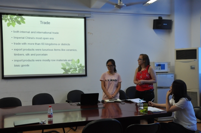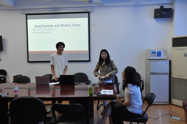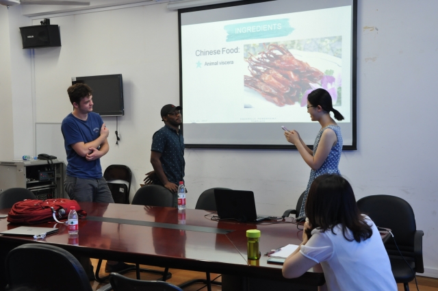 在课堂中,中外学生以“结对子”的学习方式共同讨论,课后共同交流,分组共同完成课堂展示等学习任务。在暑期项目最后阶段的展示环节中,中外学生分组合作,进行项目的陈述与展示。各位同学的陈述内容丰富多样、颇具洞见,话题涉及中国的风土人情、茶文化、餐饮、历史以及中外礼仪、人际关系比较等;展示中,李梅老师对各位同学的陈述进行了精彩点评,各位同学也就相关话题进了进一步的讨论。