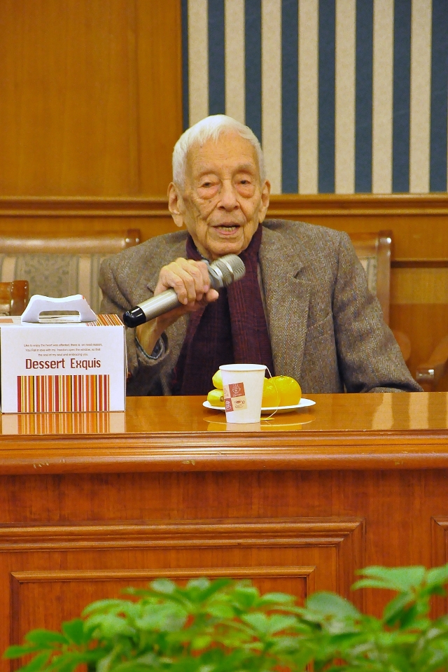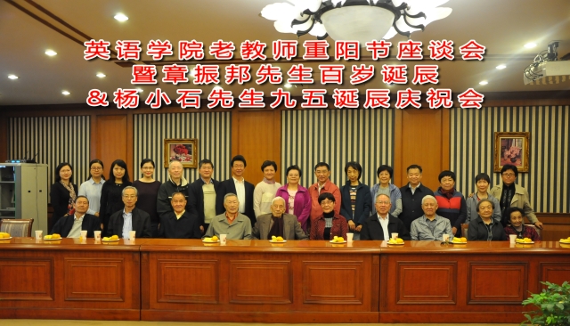 丹桂飘香,佳节又重阳。2017年10月27日,英语学院在虹口校区会议中心英伦厅举办老教师重阳节茶话会暨章振邦百岁华诞、杨小石先生九五华诞庆贺会。 杨小石、何兆熊、邱懋如、章伟良、吴定柏等二十位退休老教师,英语学院院长查明建、党总支书记孙俭,以及青年教师和博士研究生代表欢聚一堂共度重阳,共话两位老先生的教学和学术成就。