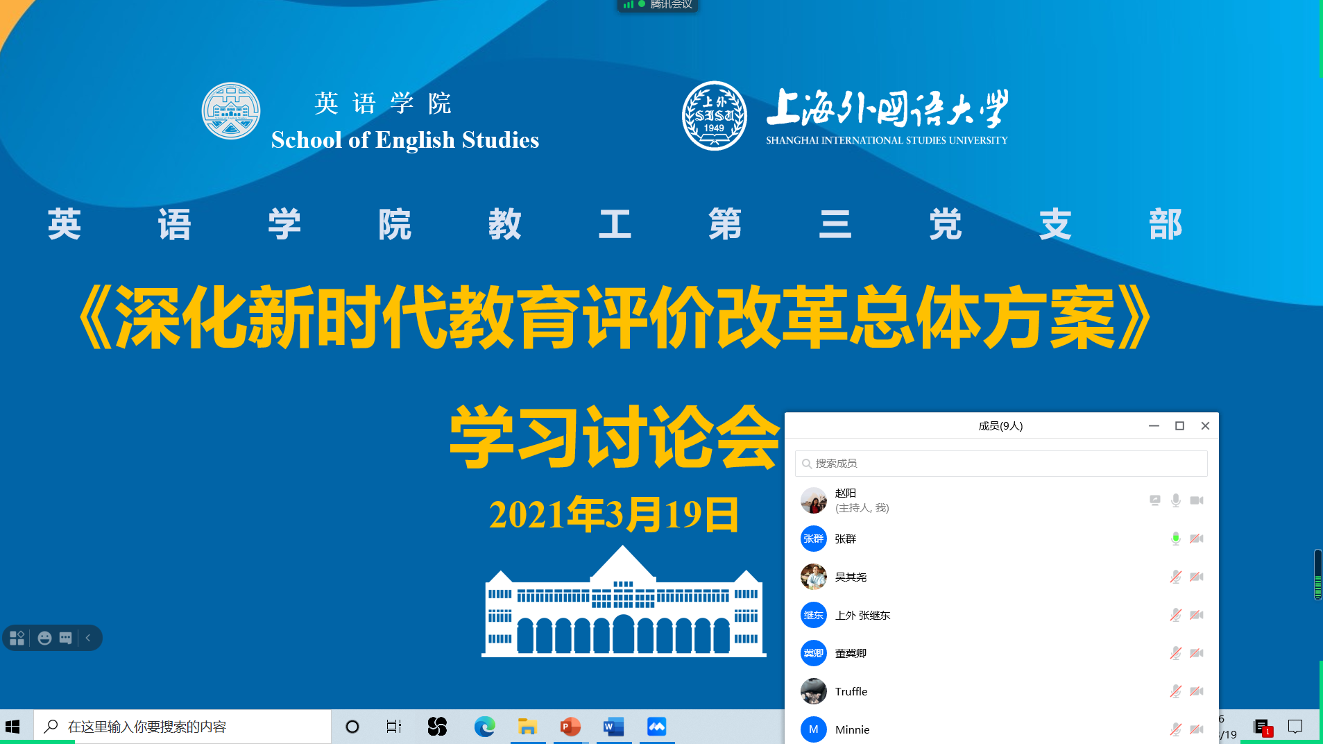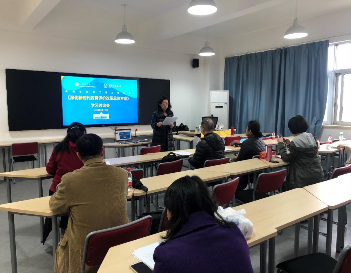 为深入贯彻习近平总书记关于抓好《深化新时代教育评价改革总体方案》落实落地的重要指示精神,进一步落实我校我院教育评价改革工作,2021年3月19日,英语学院教工第三党支部、教工第四党支部组织党员教师参加《深化新时代教育评价改革总体方案》学习讨论会。党支部还邀请了多位非中共党员教师列席,集体学习交流。
