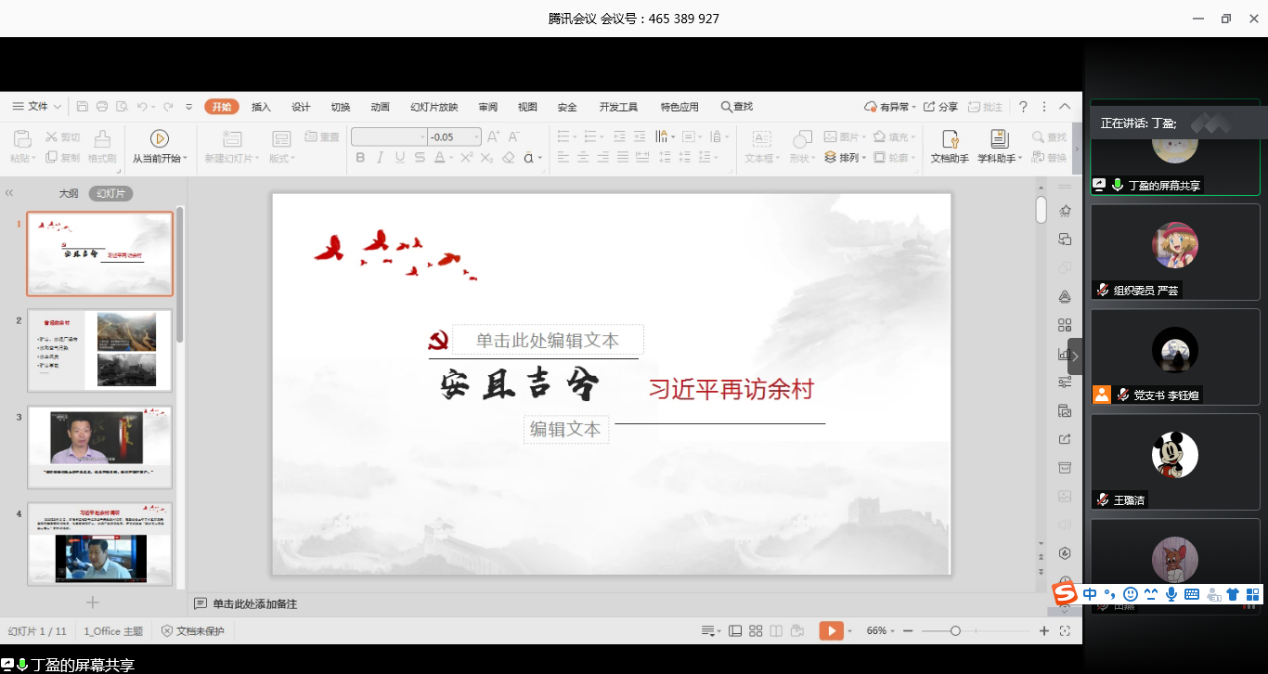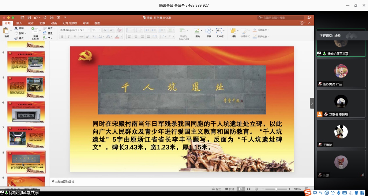 新中国成立后,社会主义革命和建设的伟大实践给中国带来了翻天覆地的变化。英语学院研究生第二党支部以家乡风貌的变迁为学习路径,致力于讲好红色故事,更加真切感受人民当家作主的全过程,让红色精神润物无声。习近平总书记时隔14年再访余村的故事让支部党员丁盈真正理解了“安且吉兮”的含义。十多年来,余村以党带群,党群互助,在习近平总书记“两山论”指导下发展生态休闲旅游经济。2019年,全村农村经济总收入已达2.796亿元,真正实现了巨大跨越。