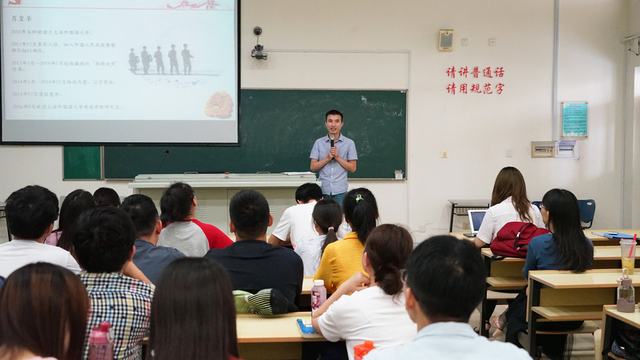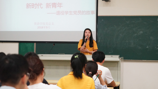 为庆祝中华人民共和国成立69周年,进一步深入学习贯彻习近平总书记系列重要讲话精神,加强对入党积极分子的培养和管理,2018年9月29日,英语学院分党校在5124教室举行了本学期第一场专题讲座。讲座邀请了英语学院四位退伍的学生党员,请他们与大家分享自己在军营的感悟与收获。党总支副书记曹原,兼职党建组织员李秀秀,兼职辅导员刘文锦以及英语学院全体入党积极分子参加了本次讲座。讲座由刘文锦主持。