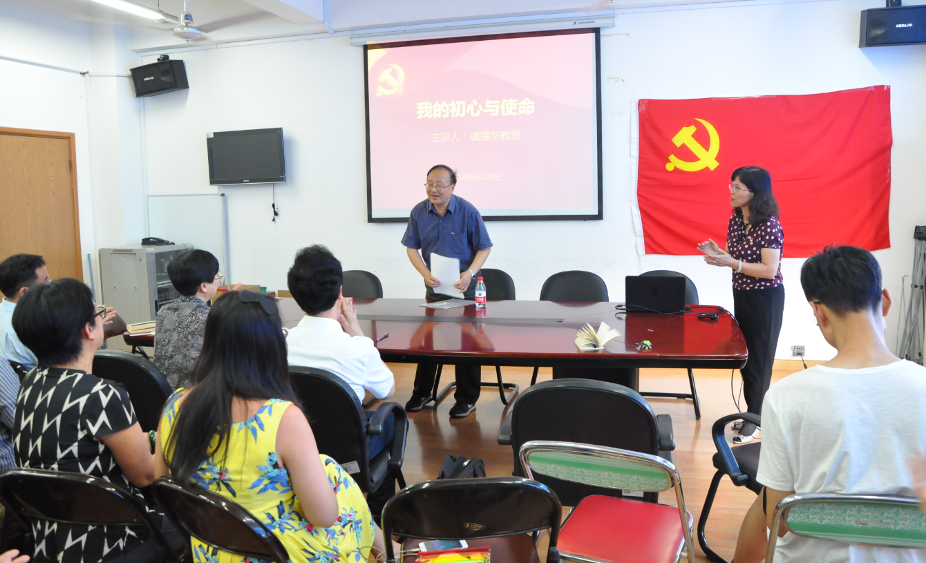 6月29日下午,为纪念建党97周年,进一步深入开展主题实践教育活动,英语学院党总支邀请我校“全国优秀教师”虞建华教授以“我的初心与使命”为主题,为学院的全体党员教师们上了一堂生动的党课。
