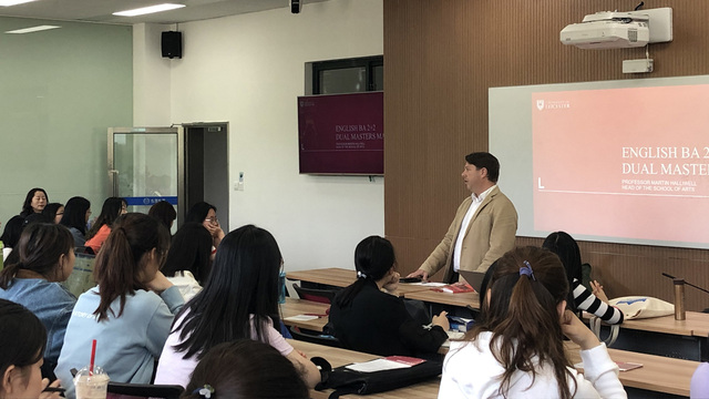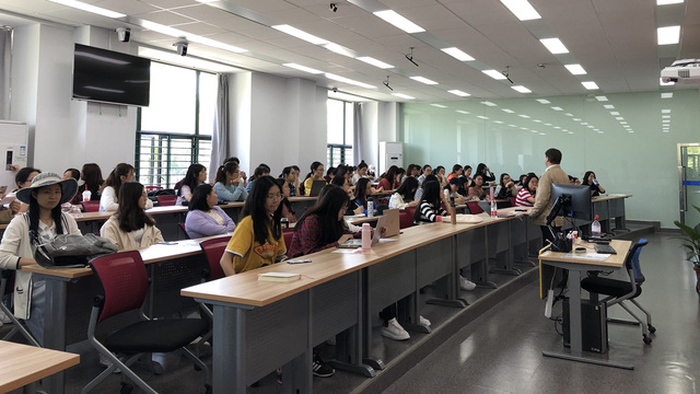 下午三点,结束了座谈的Halliwell教授又为我校80多名本科生和硕士生开展了上外-莱斯特本科“2+2”项目和硕士双学位项目的宣讲会。Halliwell教授为同学们详细讲解了项目的内容,并介绍了莱斯特大学周边的风景与生活设施。同学们在现场提及了诸如住宿和奖学金等问题,Halliwell教授耐心解答了疑问。 Halliwell教授此次访问为我校与莱斯特大学进一步深入合作打下了良好的基础。