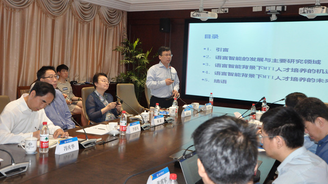 论坛开始后,专家们根据此次论坛的主题,各抒己见。来自北京语言大学的刘和平教授带来了题为“AI 背景下人机合作与语言服务人才培养”的主题发言。刘教授认为,人工智能的迅速发展,使得语言服务行业及翻译专业人才培养都面对新挑战,而“人机合作”才是应对这一挑战的有效途径。此外,她还指出,当今翻译专业建设的弊病是同质化发展,因此要提倡要多元发展、特色发展,充分发挥和利用高校服务于社会的这一功能,将职业建设和翻译技术融入到翻译教学之中。随后,来自上海交通大学的胡开宝教授就“语言智能背景下MTI人才培养”这一话题,在分析语言智能的发展历史及其主要领域的基础上,较为深入地分析了语言智能背景下MTI人才培养所面临的历史机遇和重大挑战,提出了MTI培养方案、课程设置和师资建设等方面应对语言智能发展的各项策略,建立适应智能发展需求的人才培养体系。来自中国人民大学的王建华教授探讨了“人工智能发展与翻译研究的机遇与挑战”这一话题,他认为,人工智能不仅仅为翻译专业的发展带来挑战,同时也为翻译研究开辟出新的热点,如机器翻译、人工互助翻译、译文测评研究、翻译应用研究和多模态智能终端翻译等将成为翻译研究的新领域和新对象。