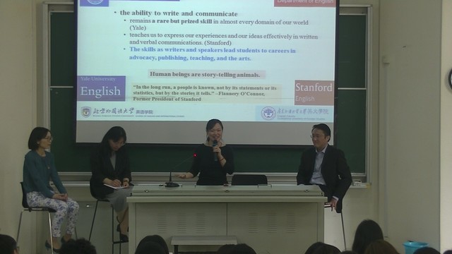 本课程负责人杨维嘉老师压轴出场。她主讲的内容是中美高校英语教育的对比分析。杨老师询问同学们“为什么选择了英语专业?”学生们踊跃回应。很多同学表示,他们是出于对英语的热爱而选择了英语专业。杨老师分享了自己的研究发现:中国一流外国语大学和美国常春藤大学的英语系,都具有很强的人文意识,注重专业内涵的人文性,在人才培养目标上有很多共同之处。中美一流外语系都致力于培养卓越的语言人才,不但写作沟通能力超群,批判性思维和创造想象力也相当出众,富有强烈的使命感和责任心。