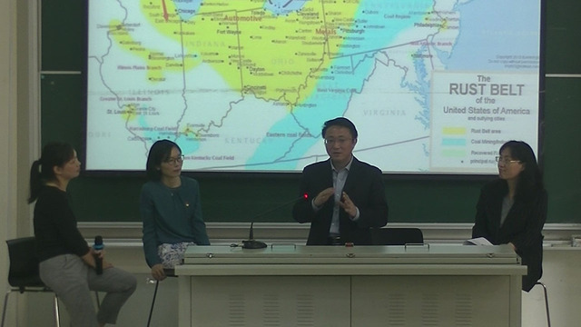 忻华教授主讲的内容是美国经济问题。他总结出美国“财富帝国”的六大特点,并阐明美国作为世界第一大经济体的历史根源、演变过程和现状。从多维、宏观的描述框架出发,忻教授阐释了美国经济基于文化、历史、地理等形成的独特的路径依赖。换言之,美国对海上贸易的依赖倒逼技术创新和产业结构不断转型。随着经济发展格局的变化,美国步入“后工业化”阶段,部分地区形成了“锈带”(美国北部衰败或萧条的工业区)。忻教授还剖析了美国国内对社会经济的看法,这些看法进一步激化了中美贸易冲突。课堂上忻教授循循善诱,启发学生思考提问,与学生对话。期间,好几位学生提出了,诸如“中国的‘锈带’出路在哪里?”“中美争端的主要原因是什么?”等高质量富含学术价值的问题。忻华教授是美国经济研究专家,逻辑思维缜密,英语演讲功底深厚,给在场师生留下了深刻印象。